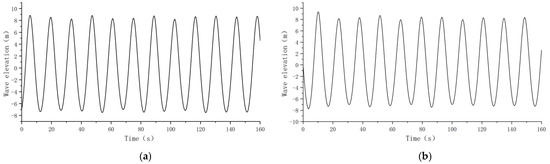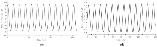 Wave surface elevation at different locations: (a) 250 m in front of the bow of the floating body; (b) 150 m in front of the bow of the floating body; (c) 50 m in front of the bow of the floating body; (d) 200 m to the left of the midship section of the floating body.