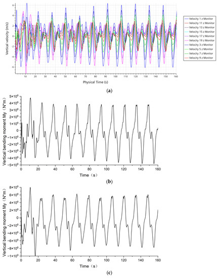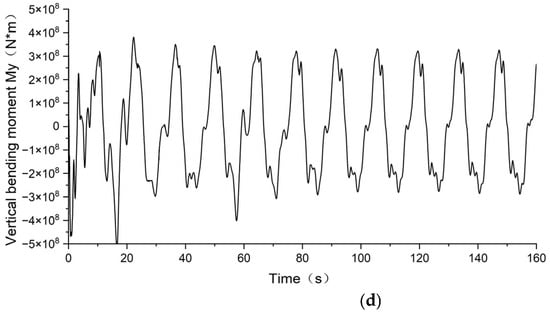 The pressure on the floating body surface is shown in Figure 19, and the vertical velocity at the center of gravity of each section of the floating body is shown in Figure 20a. Once the pressure, the vertical velocity, and the vertical acceleration are obtained, the vertical bending moment at the cross-sections of the floating body can be obtained from Equation (5), and the time histories are shown in Figure 20b–d.