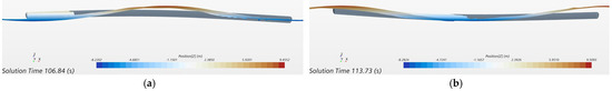 It can be seen in Figure 20b–d that the results display a periodic pattern of the wave loads on the floating body under the action of regular waves. In order to analyze the change in the wave loads on the floating body, the flow fields at the instant when the vertical bending moment of the cross-section reaches the peak and the trough are compared. For instance, it can be seen in Figure 20c that at , at the midship cross-section () reaches a peak value; at , reaches a trough value. Figure 21 shows the side views of the flow field wave surface at and , respectively. It can be observed in the figures that when the floating body is in a hogging condition, the vertical bending moment at the middle cross-section reaches a peak value, amd when the floating body is in a sagging condition, the vertical bending moment at the middle cross-section reaches a trough value, that is, the location of the wave crest and trough on the floating body causes a hogging or sagging condition of the floating body. As the wave crest and wave trough move longitudinally along the floating body, the vertical bending moment changes with time.