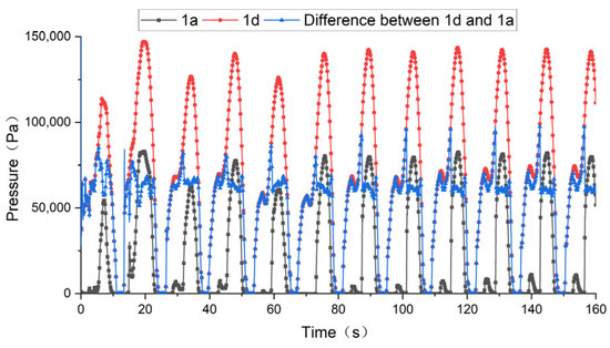 The locations of the fluid pressure monitoring points on the floating body surface are shown in Table 4, and the time history of the pressure is shown in Figure 22. Although it can be seen in the figure that the pressure extrema occur at the bow, midship, and stern of the floating body at some time instants, but no slamming occurred. In Figure 23, it can be found that, in addition to the periodic extrema of the fluid pressure, at some instants, e.g., 111 s, the fluid pressure at the stern of the floating body also has a local extremum. Since the difference in the fluid force between the bottom and top of the stern is approximately equal to the fluid force at the stern of the floating body, the fluid pressure at the top and the bottom of the stern, and the fluid pressure difference between the bottom and the top of the stern, are compared in Figure 23. In Figure 24, it can be found that at 111 s, the fluid pressures at the top and the bottom of the stern have local extrema, and the difference between the bottom and the top of the stern in the pressure also has local extrema. The instant when the fluid pressure at the stern of the floating body reaches a local extremum, the vertical bending moment at the cross-section of the floating body also has a local extremum, as shown in Figure 20b,c.