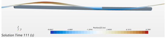 Figure 18a shows the rigid body displacements and the elastic deformations of the floating body in the vertical direction at four time instants within one wave period. The rigid body displacements of the floating body are removed to obtain the vertical elastic deformation of the floating body at four time instants within one wave period, as shown in Figure 18b. It can be seen that at , the floating body is in a sagging condition, and at , the floating body is in a hogging condition, where is the wave period.