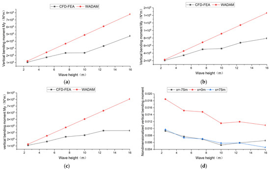 Numerical results of vertical bending moment: (a) Comparison of numerical results of the amplitude of vertical bending moment at cross-section x = −75 m; (b) comparison of numerical results of the amplitude of vertical bending moment at cross-section x = 0 m; (c) comparison of numerical results of the amplitude of vertical bending moment at cross-section x = 75 m; (d) nondimensionalized amplitude of vertical bending moment of each cross-section.