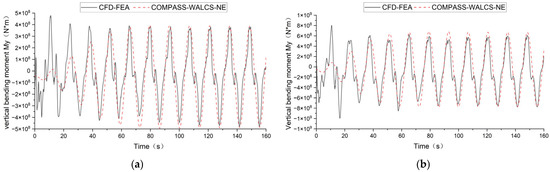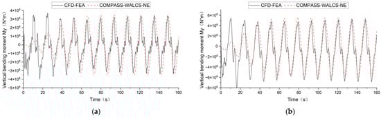 Comparison of vertical bending moment time history of cross-section at wave height 16 m: (a) cross-section x = −75 m; (b) cross-section x = 0 m.