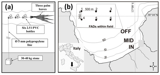 In Sicily, the use of traditional FADs, called “cannizzi”, is linked exclusively to the presence of economically important pelagic fish species commonly present along the coast, such as the greater amberjack Seriola dumerili (Risso, 1810) and the dolphinfish Coryphaena hippurus (Linnaeus, 1758) [15,16]. In this area, FADs are usually set at sea by fishermen in August. The commercial catch begins in September and ends in January [16,17]. Traditional FADs consist of palm leaves tied to floating objects (plastic bottles or polystyrene bodies) for easy positioning, and are anchored with a rope to large stones (Figure 1a).