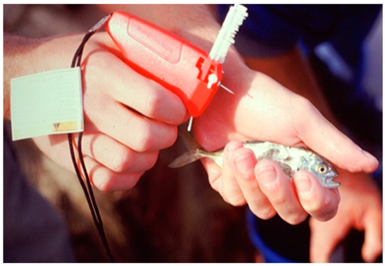 The tagging experiment was conducted on S. dumerili and C. crysos which, together, represent the most abundant species of the fish assemblage associated with Mediterranean FADs, respectively, in the summer-autumn and winter seasons [16]. These two species are resistant to manipulation and tagging as reported in other studies. The tagging experiment was carried out on 26 August 2001 for S. dumerili and 7 November 2001 for C. crysos. For S. dumerili in the sites OFF and MID, two hauls were made using a purse seine net at two FADs chosen for their central position, OFF2 and MID2. For C. crysos, a tagging experiment was performed using the same approach but fish were tagged only at FAD MID2. As soon as they were on board, fish were placed in three tanks of about 60 L volume filled with sea water and equipped with a water-circulation system. Tagging was performed using a fine fabric (INC) model small-needle-equipped gun (Figure 2). In order to identify S. dumerili tagged on OFF and MID FADs, tags of different colour were used. Fish were measured and subsequently tagged. Furthermore, in order to test for differences in movements in relation to size, fish smaller than 12 cm were tagged with tags ending in a 4 × 8 mm rectangles, while larger individuals were marked with a common “spaghetti” T-bar. Fish were released into the same FADs where they were caught by a scuba diver. Five consecutive underwater visual censuses (UVC) were performed on all of the 18 FADs of the study area (Table 1). The tagging experiment was advertised to fishermen operating in the local fisheries. In order to calculate the distance moved from the releasing to the sighting sites, the geographical coordinates, taken via GPS, were represented cartographically by the use of a GIS software.