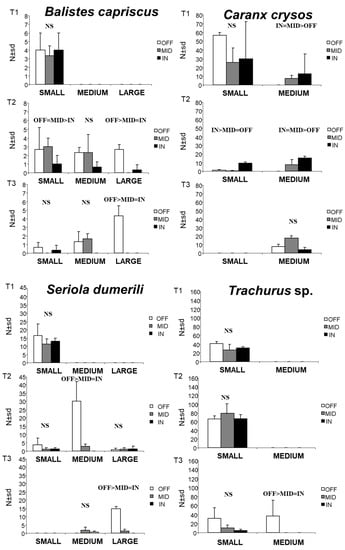Mean ± sd (standard deviation) of the individual species at the OFF, MID, and IN distances (offshore, mid-shore, inshore) separated for the three periods (T1, T2, T3) and for the three fish size classes: small (up to 10 cm), medium (10.1 to 14 cm), large (greater than 15). The results of pairwise comparisons (SNK test; NS = not significant) are also reported.