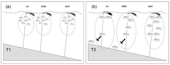 Redrawn from [18]. Possible explanation of the observed pattern for Bailistes capriscus, Seriola dumerili, and Thachurus thracurus, (a) At an earlier stage (T1) small-sized YOYs have a small ERI (dotted circle), which constrains them to the immediate vicinity of FADs. (b) Later, when fish grow (T3 ), ERI also increases and fish associated to IN and MID FADs may have a greater possibility of encountering a more suitable habitat while at OFF FADs, where ERI is smaller than the distance from the bottom, fish may thus remain associated longer and unnaturally to FADs.