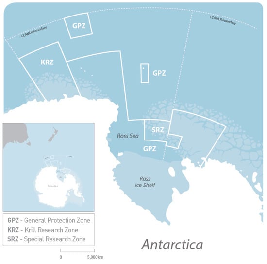 The MPA is the result of unanimous support for a joint New Zealand/US proposal within the 25-member Council for the Conservation of Marine Living Resources (CCAMLR) for environmental protection, sustainable fisheries, and scientific interests in the Ross Sea. In 2012, New Zealand and the United States made a joint proposal for marine protected areas for the first time, and the two parties reached an agreement in October 2016. On 1 December 2017, the agreement on this marine protected area came into effect. The Ross Sea MPA is the world’s largest marine protected area of the Antarctic and covers a stretch of water twice the size of the US state of Texas about 1.55 million square kilometers (https://www.mfat.govt.nz/ (accessed on 20 November 2022)). There are three different types of the Ross Sea MPA: “General Protection Zone”, split into three separate areas, is fully protected with no commercial fishing permitted; “Krill Research Zone”, which allows for controlled research into krill fishing with the aim of the MPA; and “Special Research Zone”, which allows for limiting research fishing for krill and toothfish.