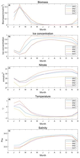 The annual cycle trends are similar in each region, but the value is different; the biomass, ice concentration, nitrate, and temperature of the SRZ are higher than for the other regions (Figure 3). Phytoplankton biomass peaks on the sea surface in February, and it is relatively low for most of the year. From March to September, the temperatures are very low but the ice concentrations and the salinity are high. Since the sea surface is covered by sea ice, the biomass during this period is close to zero.