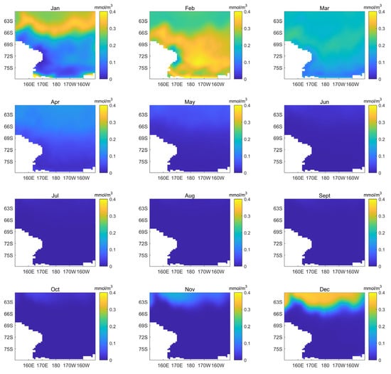 Map of monthly average phytoplankton biomass (mmol/m3) in the Ross Sea region from 1958 to 2018.