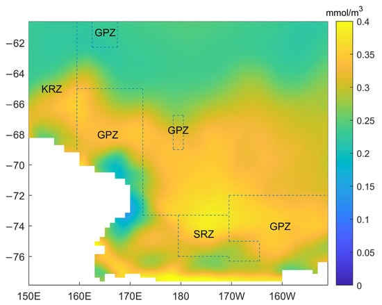 Because of the influence of clouds and sea ice, it is difficult to obtain continuous and complete monitoring datasets in the Southern Ocean []. This study used a sea ice model to simulate and obtain data on environmental factors and biomass in the Ross Sea. We investigated the relationship between environmental variables and phytoplankton biomass through statistical methods and studied possible regional differences in these variables in the general protection zone, the special research zone, and the krill research zone. The results provide a basis for future protected area management. The first step was to sort the data according to the different areas. We used the areas described in the CCAMLR document, Conservation Measure 91-05 (2016) (Figure 2).