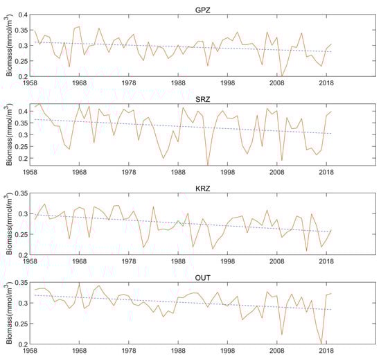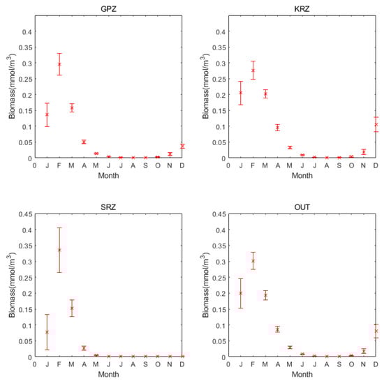 Figure 7 shows the monthly average biomass and the variance for each region. In the SRZ region, average the biomass is the highest, with 0.334 mmol/m3, and has the largest variance of 0.0701. This means that there have been relatively large fluctuations in the SRZ region between the different years. Despite this, it still has higher biomass than the other regions. The GPA and OUT region average biomass of 0.2952 mmol/m3 and 0.3012 mmol/m3, respectively, both close to 0.3 mmol/m3. Additionally, the variances are 0034 and 0.02687. The KRZ region has the lowest average biomass with 0.276 mmol/m3 and a variance of 0.0294.