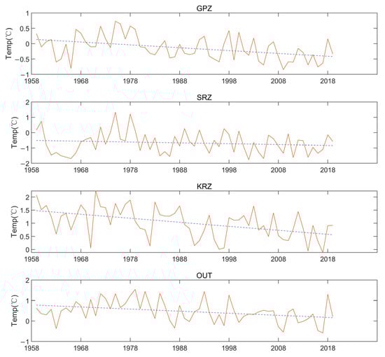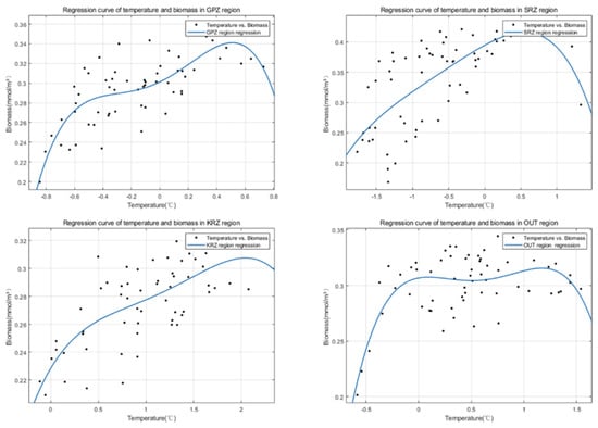 In general, as the temperature rises, the biomass in different regions increases (Figure 10). The basic quartic polynomial fitting function is defined as . This trend confirms the results observed in Figure 9 and is consistent with the positive correlations obtained in the third and fourth parts of the results. However, the temperature sensitivity is not the same according to the region considered. The KRZ area reaches the peak of the biomass at 2 degrees centigrade. The maximum value of biomass in the SRZ region is the largest, which is consistent with the results shown in Figure 7. Although subtle, there is a trend whereby biomass begins to decline as the temperature increases.