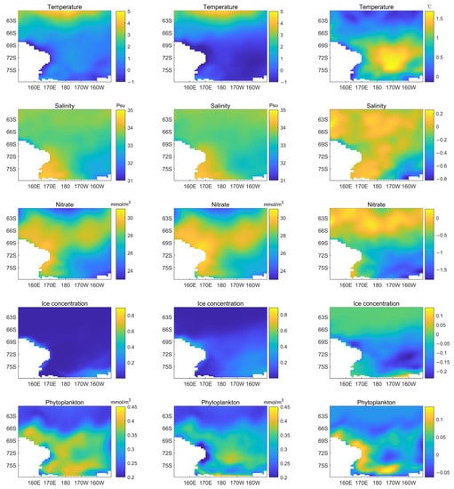 To explore unusual temperature trends in the dataset, we picked the five warmest February months of all available years and compared the averages. On the left side of Figure 9 is the average of the five warmest Februarys, in the middle is the average of Februarys over the calendar years, and on the right is the difference between them. The temperature difference is mainly distributed in the southeast Ross Sea, SRZ region, and some GPZ regions. The same observation can be made for salinity. The southwest corner of the Ross Sea has higher salinity. Nitrate distribution is very similar. Nitrate concentrations typically fall during the warmest years. Nitrate differences are concentrated in the northern Ross Sea, and their distribution appears to vary with latitude. Since February is the hottest month in Antarctica, sea surface temperatures are generally above freezing and the ice concentration is almost zero. On average, only a small amount of ice exists in the Northeast each year. In the warmest years, phytoplankton biomass increases, with significant increases in coastal areas. Notably, phytoplankton biomass increased significantly in the SRZ and GPZ regions but remained low in the southeast.