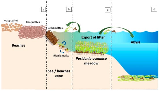 Meadow of Posidonia oceanica organs: (a) beaches with Egagropiles and banquettes; (b) beach zone with dead mattes and meadow organs in ripple marks; (c) Posidonia oceanica meadow with its coastline being exported to the abyss; and (d) the abyss with clusters of various organs of the meadow [7].