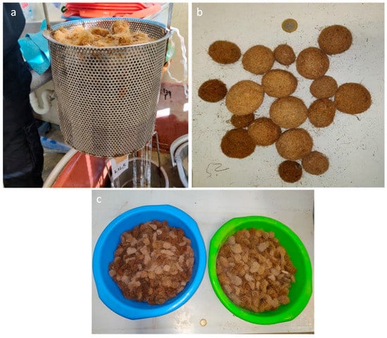 (a,b) Posidonia oceanica and drying ball samples as the raw material, and (c) the samples after washing.