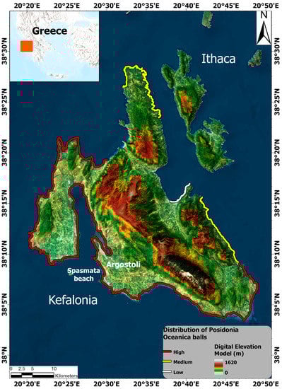 The sampling area was Kefalonia Island, which belongs to the Ionian Islands and lies at the external edge of the Hellenides fold-and-thrust system created in response to the Cenozoic continental collision following the closure of the Tethys Ocean [24,25,26]. The following geomorphological map illustrates the spatial distribution of PO in Kefalonia Island’s coastal region (Figure 3). Specifically, the white line (central part) represents coastal regions with a low distribution, while the yellow (northern and eastern sides) and red lines (southern and western areas) depict regions with a medium and high distribution of Posidonia oceanica balls, respectively.