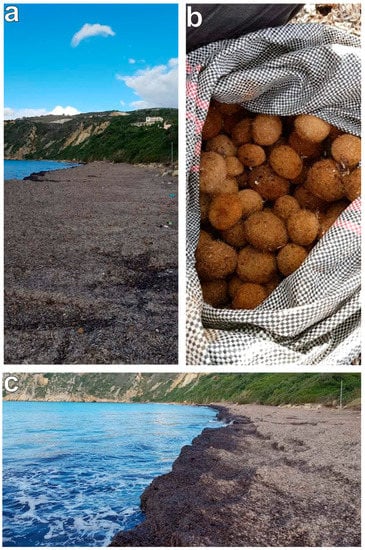 (a–c) Posidonia oceanica balls in Spasmata Beach (southwest part of Kefalonia Island).