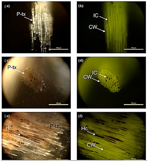 Photomicrographs of Posidonia Oceanic balls taken under white incident light (a,c,e) and blue-light excitation (b,d,f) in oil immersion and total magnification of ×500: (a,b) view in parallel to the PO fibers showing visible cell structure and strong internal reflections and fluorescence of cellulose and semi-cellulose remnants; (c,d) view in perpendicular to the PO fibers; and (e,f) view in parallel to the PO fibers showing visible infilling of the intracellular space with humified non-fluorescing colloids, which have probably originated from the protoplasm (CW: cell-wall, Hc: humic colloids, IC: intracellular space, P-tx: pre-textinite).
