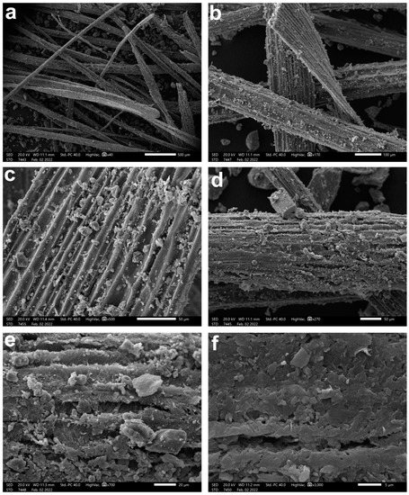 The SEM method was chosen to describe the structural features and degradation of biomass surfaces at the cellular and nano-resolution levels. In this study, fibers of Egagropili were observed using SEM, as it is shown in Figure 6. The connectivity and mechanical response of the PO balls are relative to the nature of the fiber components. For this reason, we visually analyzed Posidonia fibers using electron microscopy. A characteristic example is presented in Figure 6b, where it can be seen that the fibers are slender objects and have a typical cross section of 100 μm in width. We notice that these fibers are mainly resided at the surface, and their damage might be caused by the action of the surrounding environment. The SEM images showing the surface microstructure of the grinded Egagropili fibers indicate that Egagropili have a typical lignocellulosic fibrous structure, and the determined fiber length is between 1 and 2 mm (Figure 6). The observed agglomeration of some fibers of Egagropili is probably due to, as previously reported, the hydrophilic characteristics of cellulose (Figure 6) [30].