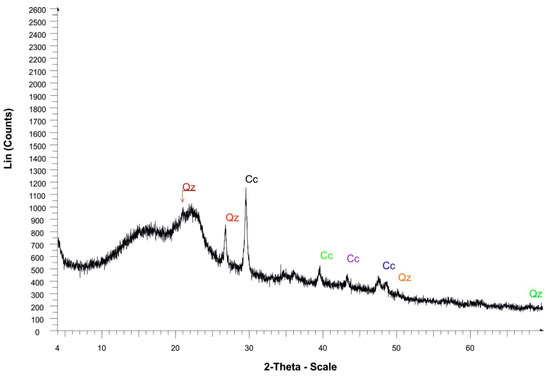 Regarding the study of the XRD patterns (Figure 7), the main minerals, which were identified in the samples, are calcite (Cc) and quartz (Qz), with an amount of 77.8% and 22.2%, respectively. It can be deduced from this figure that all the samples show three main peaks at 2θ = 16.5°, 22.6°, and 34.5°, corresponding to the (110), (200), and (004) crystalline diffraction planes of cellulose type I, respectively. The appearance of the peaks at 2θ = 16.5° and 2θ = 22.6° in all XRD patterns confirms that the cellulose present is of type I. Silicate minerals seem to be responsible for maintaining the rigidity of plant tissues and, nevertheless, are considered to enter into feedstock through endocytosis during the growth stage [31]. The percentages are semi-quantified on the crystalline phases of the Posidonia oceanica balls after being grinded in an agate mortar. In the crystalline phase, the cellulose fibers are ordered by inter- and intramolecular hydrogen bonds, while in the non-crystalline phase, the network does not have an organized structure [32]. The differences in the structures determine the different accessibilities of hydroxyl groups during the synthesis of cellulose acetate. The amorphous part consists of random orientation of cellulose chains.