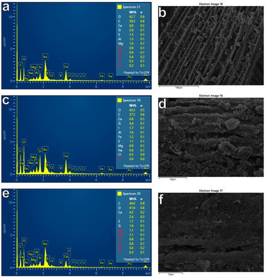Figure 8 below shows the elemental analyses of the Posidonia oceanica balls used in this study, as analyzed through a scanning electron microscope (SEM). As it can be determined from the previous analyses of the representative samples, the last images display typical characteristics, and they are rich in organic materials. It is also obvious that silicon and calcium prevail secondarily in the Posidonia oceanica balls of Kefalonia. These percentages of silicon and calcium are likely to adversely affect the process of future chemical recovery and, therefore, could be a serious disadvantage. Nevertheless, it should be noted that possible contamination of the raw material with sand is likely to be responsible for this fact as the coastal areas of Kefalonia present mineral raw materials, and such materials, which are rich in calcium and silicon, will produce their corrosion. In Table 2, the pH values, as they have been calculated in the dried samples of PO balls, are given.