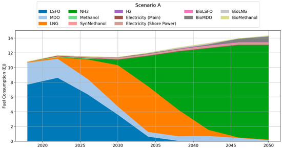 Available alternative fuels for ships include liquefied natural gas (LNG), methanol, ammonia, and hydrogen. Smith et al. [7] predicted the fuel types that will be used in the future to achieve the goal of net-zero emissions by 2050, as shown in Figure 1. LNG is expected to replace traditional fuels, such as low-Sulfur fuel oil (LSFO) and marine diesel oil (MDO), and become the primary fuel in the near future. The use of ammonia is expected to grow considerably after 2030, and ammonia will become the dominant maritime fuel by 2050. According to Burel et al. [8], the usage of LNG may reduce carbon emissions by up to 25%. Therefore, an LNG dual-fuel ship was considered in the present study. An assumption was made that such a ship can be set to sail with any fuel ratio between 100% fuel oil and 100% LNG in the dual-fuel mode [9].