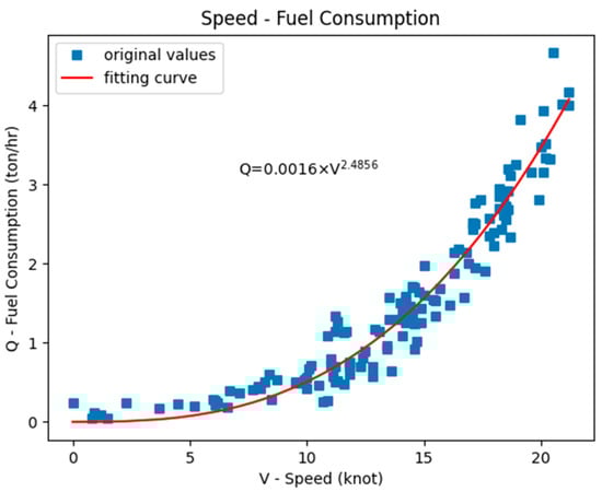 To predict fuel consumption during a voyage, the relationship between the fuel consumption rate and ship speed must be considered. This relationship is often represented using a mathematical power curve, as shown in Figure 2. The dependence of the fuel consumption rate on different factors—such as the machinery being used (e.g., main engine, auxiliary engine, and boiler), the conditions of the voyage (e.g., sailing, maneuvering, and at berth), and the port-to-port legs of the voyage [26]—must also be considered. Moreover, the effects of weather and sea conditions on fuel consumption could be examined under different slip ratios. The different fuel consumption rates set for different voyage legs can be used to simulate differences in weather and loading conditions between these legs [27]. To account for the effect of ECAs on the LNG dual-fuel ship, the fuels considered were 0.1% sulfur fuel oil, 0.5% sulfur fuel oil, and LNG. Within ECAs, only 0.1% sulfur fuel oil and LNG were allowed, whereas outside ECAs, all three types of fuel could be used. However, in this study, the fuel options outside the ECAs were limited to either a combination of 0.1% sulfur fuel oil and LNG or a combination of 0.5% sulfur fuel oil and LNG.