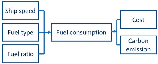 The variables of NSGA-II, which are also known as genes, were the arrival time within the given time window of each port of call and the LNG/oil ratio of each leg. The two objectives of this algorithm were cost minimization and carbon emission minimization. After the arrival times and LNG/oil ratios of each voyage leg were determined, the fuel consumption was estimated. Finally, the two objectives were achieved using the estimated fuel consumption, current fuel prices, carbon permits, and fuel carbon factor (Figure 3). The nomenclature and abbreviations used to establish the numerical model are shown in Table 2.