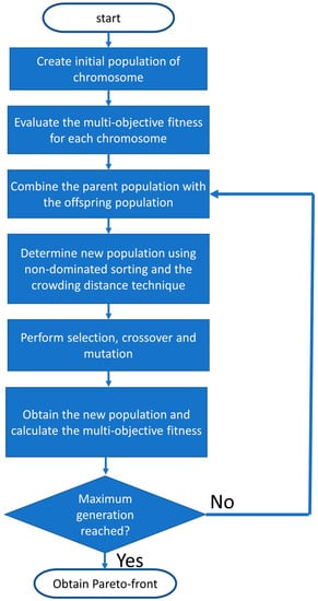 As a genetic algorithm, NSGA-II comprises two crucial parameters: population size and number of generations. The population size is the number of agents that search for the optimal solution in the possible solution space, and the number of generations is the number of iterations for which the agents have searched the entire search space. The termination condition is usually set by limiting the number of generations. Increases in the population size and number of generations result in more accurate solutions; however, the computation process becomes longer. Therefore, for a complex problem with a larger possible solution space, NSGA-II with longer evaluation time is required to obtain acceptable optimized solutions. Determining an appropriate population size and number of generations for a problem can be challenging.