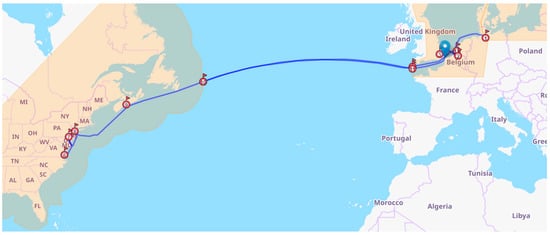 The methodology outlined in the aforementioned text was adopted for a 4600-TEU container ship conducting a complete voyage. The itinerary considered commenced in Western Europe and proceeded to the eastern coast of North America through the Atlantic Ocean. The ship subsequently sailed back to Europe and concluded its journey at the starting port of call. The trip comprised nine ports of call, which included the initial and final ports, and four waypoints where oil changes occurred between ECAs and non-ECAs. Consequently, 12 legs had to be traversed, with 12 arrival times and 12 LNG/oil ratios to be determined. Data on the considered journey are presented in Table 3, Table 4 and Table 5, and a map of the considered route is displayed in Figure 5. The orange regions in Figure 5 indicated the ECAs.