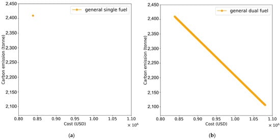 PF figures for a (a) general single-fuel ship and (b) general dual-fuel ship. (a) The carbon emission and the cost had no trade-off on single-fuel ship; thus, it was one optimal solution and a single point on PF figure. (b) For the general LNG dual-fuel ship, the two objectives had conflicts, and the optimal solutions would become a straight line.