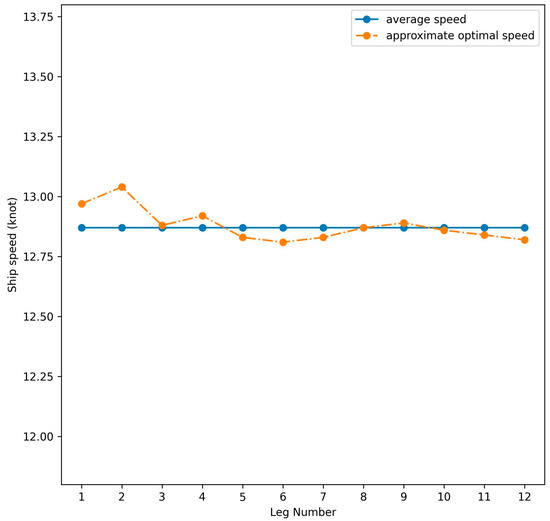In the considered examples, the weather conditions and fuel consumption in a journey leg were assumed to be constant; therefore, the theoretical optimal sailing speed of the general single-fuel ship and general dual-fuel ship were the average speed for all the legs. However, NSGA-II is an evolutionary algorithm and can only search for the approximate optimal solution, as shown in Figure 7. It theoretically takes infinite time to obtain the exact average speed profile.