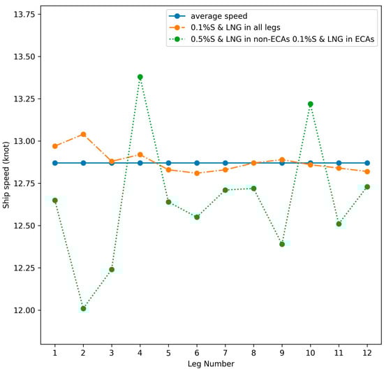 All legs except leg 4 and 10 were assumed to be in ECAs, and legs 1–5 and 9–12 were assumed to be under the jurisdiction of EU ETS. The EU ETS was assumed to consider the 100% of carbon emission for legs 1–2 and 12, while considered 50% of carbon emission for legs 3–5 and 9–11. By comparing Scenario 1 with Scenario 2, the effects of using dual-fuel ships could be demonstrated. By comparing Scenario 2 with Scenario 3, the impacts of ECAs could be investigated. By comparing Scenario 2 with Scenario 4, the effects of the EU ETS could be determined. In these comparisons, Scenario 1 served as the control group when compared with Scenario 2, while Scenario 2 served as the control group when compared with Scenarios 3 and 4. The optimal speeds of Scenario 1 and 2 were also compared with the theoretical optimal speeds (average speed) for validation. Since Scenario 1 represented a general single-fuel ship, speed was the only variable being optimized.