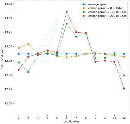 The rules of the EU ETS might also affect the optimal speed profile and fuel ratio. The EU carbon permit is assumed to be 100 or 200 USD/ton; as a result, the PFs were moved to the right, as shown in Figure 10. Consideration of these rules might result in marginal reductions in ship speed in areas under the 100% jurisdiction of the EU ETS (legs 1, 2, and 12 in Table 5) to reduce the cost incurred for EU carbon permits. Therefore, the cost optimal ship speed outside the EU would increase to comply the set time window, as shown in Figure 11. The bottom-right solution was the carbon emission minimization solution and thus still represented the average speed profile. Moreover, the cost minimization solution still involved the use of 100% fuel oil, whereas the carbon minimization solution involved the use of 100% LNG.
