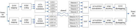 The block diagram shown in Figure 2 represents the system combining orthogonal frequency division multiplexing (OFDM) modulation and STBC technology. As illustrated in Figure 2, the transmitter of the system is based on LEDs and the receiver detectors. The binary bit data stream is constrained by quadrature amplitude modulation (QAM) mapping. These QAM symbols are encoded by STBC technology and then asymmetric clipped OFDM (ACO-OFDM) is used for modulation to attain OFDM symbols. At the end, they are transformed into an optical signal using LED after performing a clipping process. When the optical signal arrives at the receiver, four large optical spots are attained by imaging using an imaging lens. The multiple detectors covered by each light spot are combined using EGC technology, and the combined data is obtained after demodulation by ACO-OFDM. Finally, through STBC decoding and QAM demodulation, the received data stream is obtained.