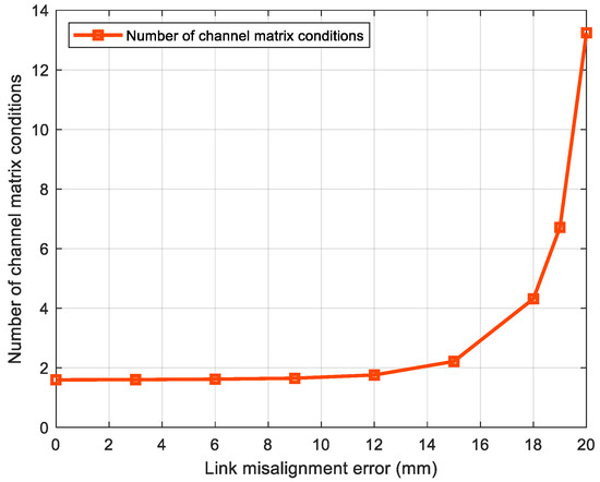 Figure 5 represents the relation between the condition number of channel gain matrix and the offset due to the relative offset of the transmitter and receiver in the plane, which is expressed by the condition number of channel gain matrix [25]. The condition number of channel gain matrix increases when the relative offset of the transmitter and receiver is increased. When the condition number of channel gain matrix is small, the interference between the receiver signals is also small and can be achieved through direct demodulation. By increasing the degree of link misalignment, we notice an increase in the condition number of channel gain matrix; meanwhile, the interference becomes high, and direct demodulation of the signals cannot be performed.