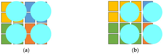 Figure 3 shows the image spot distribution representation of the receiver under alignment and misalignment scenarios. The relative offset generated by the transceiver in the plane is divided into two parts of parallel x-axis and y-axis through the geometric decomposition technique. As shown in Figure 3b, the receiving detection will obtain various optical spots at the same time due to link misalignment, which will lead to increased interference between the MIMO system sub-channels.