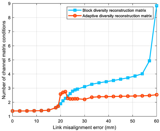 The adaptive diversity approach introduced in this study reduces the impact of link misalignment on communication systems by detecting and tracking the degree of link misalignment and using different diversity combinations. The channel gain matrix needs to be reconstructed due to the block diversity used in LED at the transmitter of the Massive MIMO system. As shown in Figure 8, it is the condition number of the channel gain matrix under different misalignment errors using adaptive diversity processing and block diversity processing, respectively, in the weak turbulence environment. When the degree of link misalignment is small, the condition number of the matrix reconstructed by adaptive diversity is the same as reconstructed by block diversity. When the link misalignment error is greater than 20 mm and the condition number of channel gain matrix increases rapidly, the adaptive diversity algorithm reduces the interference between different diversity blocks by changing the detector merging scheme at the at the receiver side. Since the switching decision of the adaptive diversity algorithm for the detector merging scheme is hard, which generates a certain error, it leads to a higher correlation between different diversity blocks when switching the merging scheme compared to the unswitched detector merging scheme. However, with the increase in the link misalignment degree, the condition number of the matrix after adaptive diversity reconstruction is smaller than that of the channel gain matrix after block diversity reconstruction, because adaptive diversity determines the degree of link misalignment through the matrix obtained by channel estimation. The receiver side selects a suitable detector merging scheme for the reception of the offset optical signal and the channel gain matrix condition number is reduced.