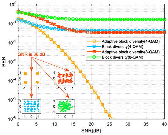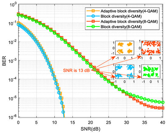 Figure 10 shows the BER performance of the 16 × 16 MIMO system with adaptive diversity and block diversity schemes at different QAM modulation orders in a weak turbulent environment with a link misalignment error of 23 mm. As the link misalignment error increases, the point bias of the system receiver also increases. At this time, the signal combination scheme used in the original diversity scheme at the receiver not only fails to bring signal combination gain, but also enhances the interference between signals. The adaptive diversity algorithm uses different received signal combination schemes, as the degree of link misalignment increases. By optimizing the receiver signal combination scheme, we notice a reduction in the correlation of the channel gain matrix and an improvement in the BER performance of the system.