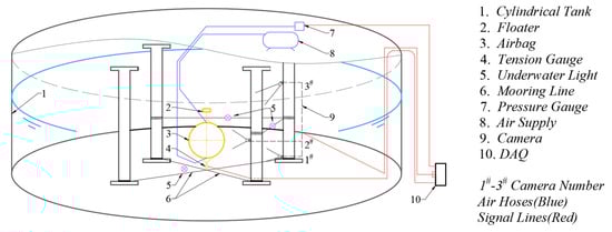 The tank was a cylindrical underground reservoir 3 m high and 11 m in diameter, with a maximum water level of 2.75 m. The configuration is shown in Figure 2. The pondage was more than 220 t, which was much more significant than the maximum displacement of the airbag, and the water surface area was sufficiently large such that the influence of variations in airbag volume on the water level could be neglected during the experiment without water flowing in and out.