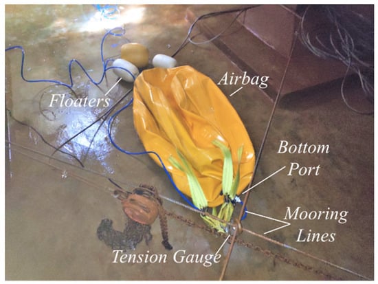 Installation of the empty airbag model, tension gauge, and mooring lines.