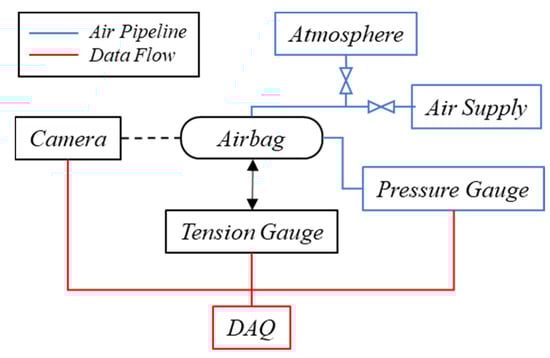 Two 8 mm polyurethane pipelines were attached to the two ports of the airbag. One connected the airbag with a three-way valve that led to the air supply and atmosphere, and the other linked the airbag and gas pressure gauge. The gas flow and measurements were arranged through different ports and pipes, thereby preventing the gauge from being influenced by the stream. A block diagram of the airflow and data flow is shown in Figure 5.