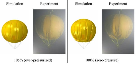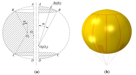Because of the geometrical particularity, a spherical surface could not be obtained directly through a flat film material. The material was cut into several identical meridional spindle-shaped lobes, which were distributed along the equator and formed the majority of the sphere. Two disk pieces were cut to cover the top and the bottom. These pieces were welded together, and additional reinforcement strengthened the meridional and circular welding lines. The two disks were tailored from a flat material without curvature, such that the final full-filled shape was not ideally spherical but oblate (Figure 1).