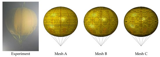 The properties of ordinary surfaces were set to be the same as those of the PVC-coated fabric, and the material property was assumed to be isotropic in the simulation. The reinforced surface had the same material but was three times thicker than the ordinary surface. The S4 and S3 elements are used at the envelope, and the entire internal side was set as a fluid cavity with F3D4 elements in Abaqus/Explicit []. The straps were designed to withstand only tension, hinged at the mooring point and completely tied to the airbag.