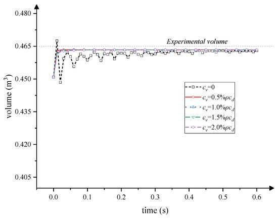 Table 3 shows the simulated volume results in these five simulations for 0.6 s with respect to the experimental parameter. The computational time for all scenarios was within 4.11–4.32 h. For , the cavity volume fluctuated for a long time and hardly converged (Figure 8). The existence of viscous pressure stabilized the value and shortened the convergence time, which was beneficial in reducing the time cost. The four scenarios with viscous pressure revealed an acceptable effect, thus, was adopted in the numerical model.