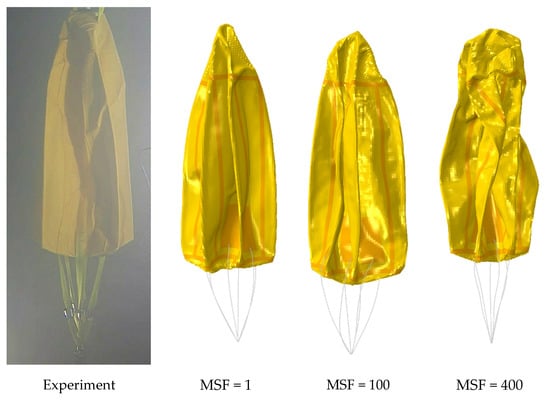 As shown in Figure 9, a comparison of the simulated shapes with the experimental one shows that the empty shape when MSF = 400 was overtwisted. It can be seen that the high MSF introduces a significant inertial effect, resulting in the apparently unstable motion of the top surface in the final deflation stage. The comparison shows that the overall structure with MSF = 400 has excessive deformation from the physical reality. The results of MSF = 1 and MSF = 100 are consistent with the experiment, and the simulation meets the quasi-static requirements. Hence, MSF = 100 was applied in the subsequent simulations considering the cost of calculation time.