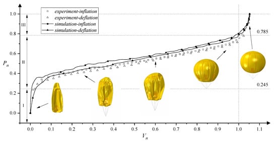 The relationship between and during the cycle is shown in Figure 10. The dashed line at is the theoretical zero-pressure reference line, and the dashed line is the empty-shape reference line. The curves of the simulation and experiment exhibited identical trends and could be divided into three phases by the two reference lines.
