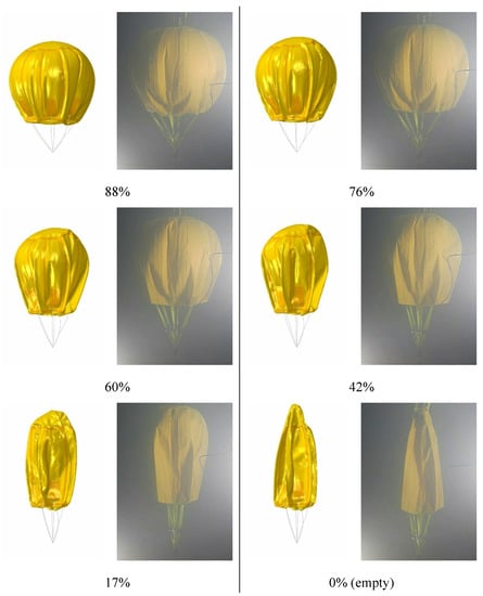 A comparison of the simulation and experiment for the 1 m airbag is shown in Figure 11. From the over-pressurized airbag, the lower part of the envelope under the specific hoop of the attached straps moved upwards and caused the bottom to become concave with the reducing volume. The angle between the straps and the center axis decreased. The meridian lines along the straps gradually pressed on the surface, causing wrinkles to extend towards the top. The concave and wrinkled surfaces fold twice along the specific hoop forming a six-point crease. The folding gradually deepened with a decrease in the inflation ratio. Finally, the deformation formed a carambola-shaped, six-pointed airbag, and the empty underwater shape differed from that in the air. These results implied that the simulation results were in good agreement with the experimental results.