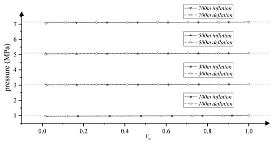 The inflation and deflation processes had the same pressure–volume variation in each case, and the pressures of different scenarios exhibited similar trends, as shown in Figure 13. The four horizontal dashed lines represent the rated pressure of the zero-pressure airbag at the designated depths. The air pressure in four scenarios was slightly lower than the rated pressure. The pressure range in each case was significantly lower than the corresponding rated pressure and equated to the water head height of 4.28 m, which was approximately the height between the top point of the empty shape and the bottom point of the zero-pressure shape.